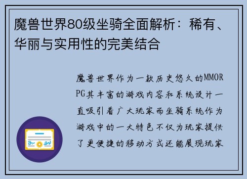 魔兽世界80级坐骑全面解析:稀有、华丽与实用性的完美结合