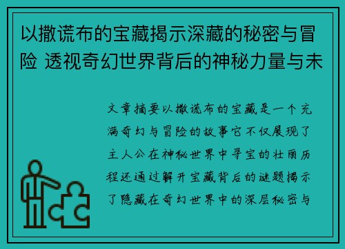 以撒谎布的宝藏揭示深藏的秘密与冒险 透视奇幻世界背后的神秘力量与未解之谜